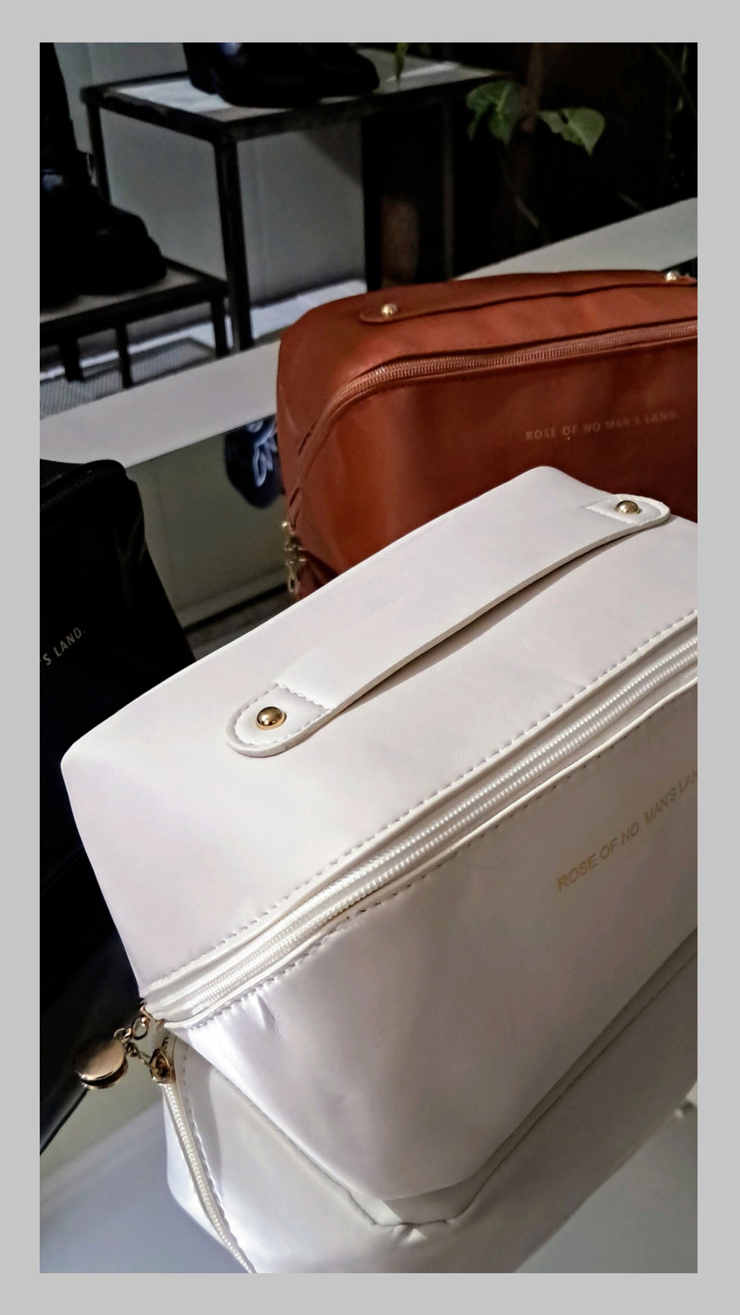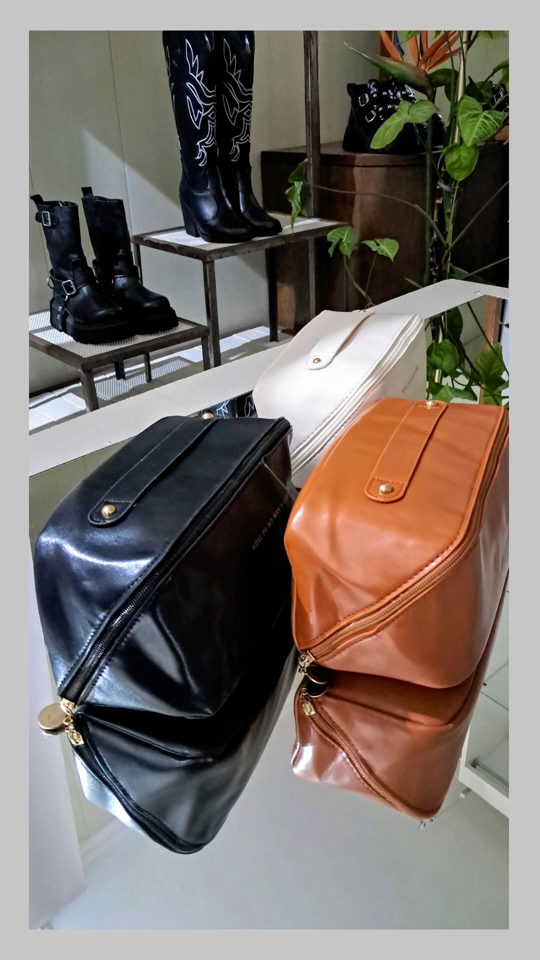 Neceser ecocuero con cierre diagonal. Tiene varios compartimentos y bolsillo central con cierre. Interior forrado.